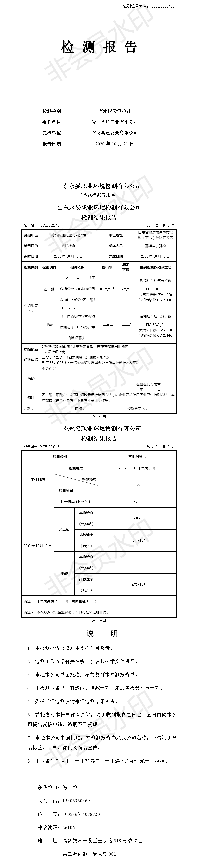 濰坊奧通藥業(yè)有限公司十月環(huán)境檢測(cè)報(bào)告