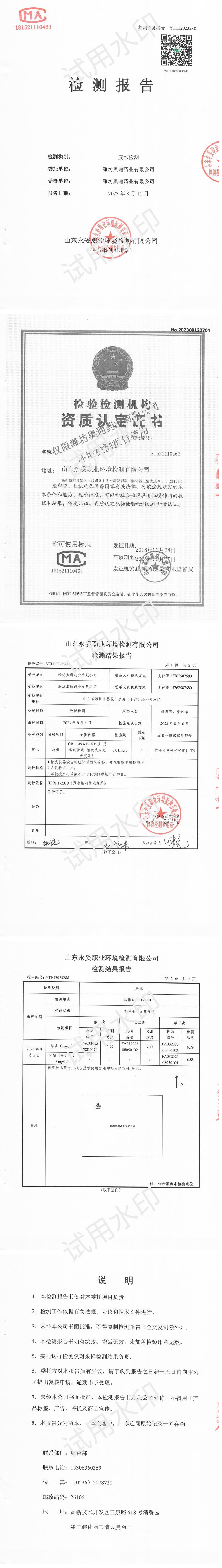 濰坊奧通藥業(yè)有限公司八月環(huán)境檢測報告