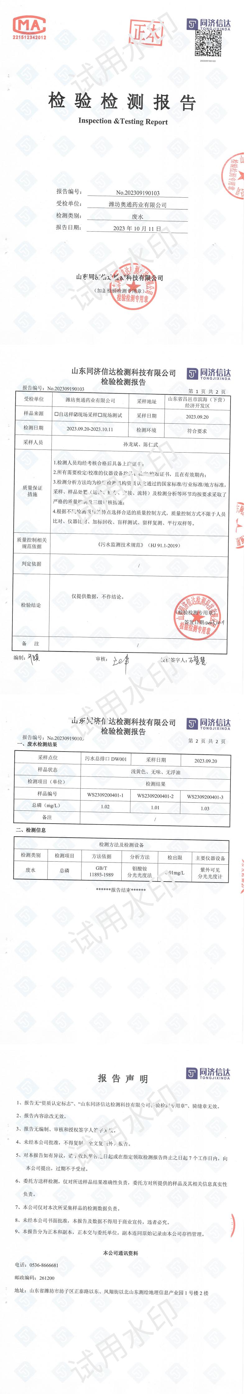 濰坊奧通藥業(yè)有限公司九月環(huán)境檢測報(bào)告