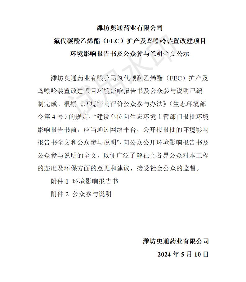 濰坊奧通藥業(yè)有限公司氟代碳酸乙烯酯(FEC)擴(kuò)產(chǎn)及鳥嘌呤裝置改建項(xiàng)目第三次公示